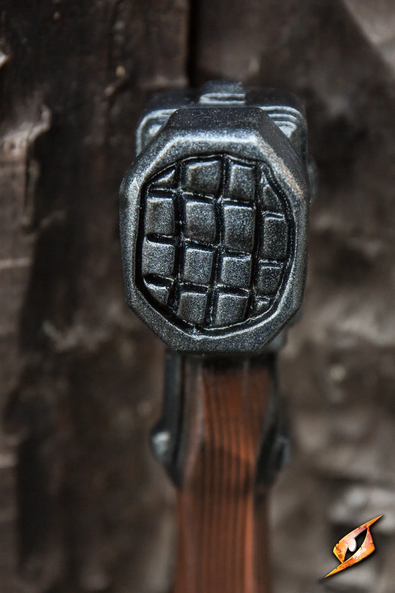 Epic Armoury’s Warhammer is an 85 cm latex warhammer inspired by weapons of the late medieval period. This particular hammerhead is a slightly larger imitation with a smaller spike, specifically designed for a fantasy appearance and regard for larp safety. The hammer’s face is octagonal, and is 7 cm long from the haft. The claw-like spike is 10 cm long. With handpainted and sculpted detail, this hammer is designed to look like worn dark wood. The 20 cm handle is wrapped in brown split leather for a superior grip.