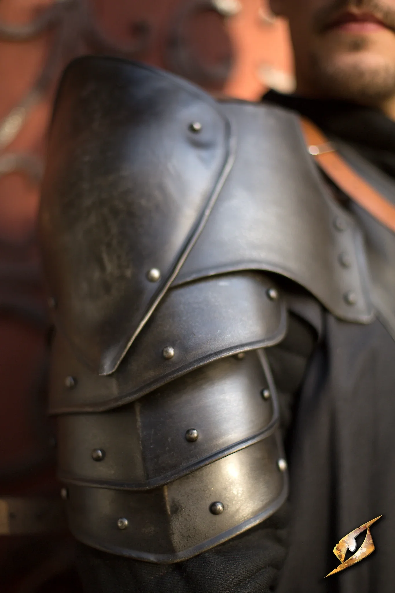 This fully articulated armor is designed to provide protection for the throat, neck and shoulders while allowing freedom of movement. The armor is a four-piece set: a two piece leather gorget and two shoulders. The gorget covers the thorax to the sternum. The two parts are fitted together with vegetable tanned top-grain leather straps. The gorget also provides fastenings for the shoulders. The shoulders are composed of articulated spaulders covering the shoulder, upper arms and molded to deflect hits toward the neck and head.