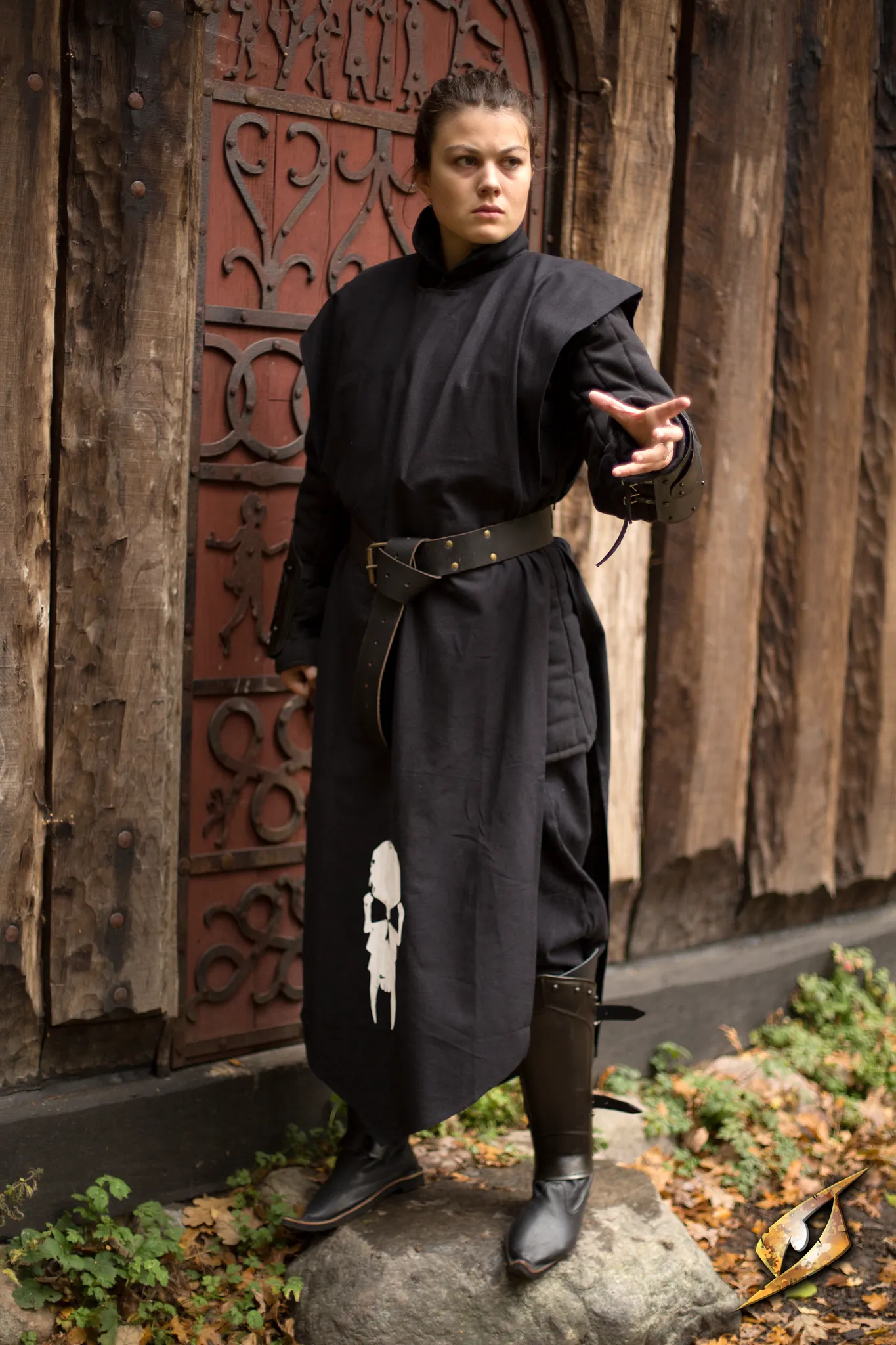 A sleeveless, open-sided garment worn over any outfit or set of armor, often with a belt. This particular tabard is solid black with a skull insignia. Whether you are a one-man army wanting to stand out, or you are in a unit of soldiers and want to blend in, you will appear full of style, class, and distinction by wearing the CQ Undead Tabard.